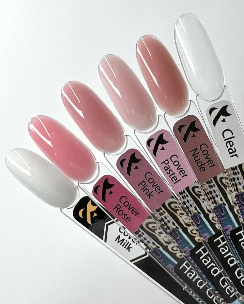 Hard Gel Clear on nestemäinen koostumus itsetasoittuva geeli.Erinomainen työhön ilman arkistointia. Voidaan käyttää paitsi pidennysten lisäksi myös kynsien vahvistamiseen. Sillä on erinomainen tarttuvuus luonnolliseen kynteen. Pitää kaaren täydellisesti ja on erittäin luja