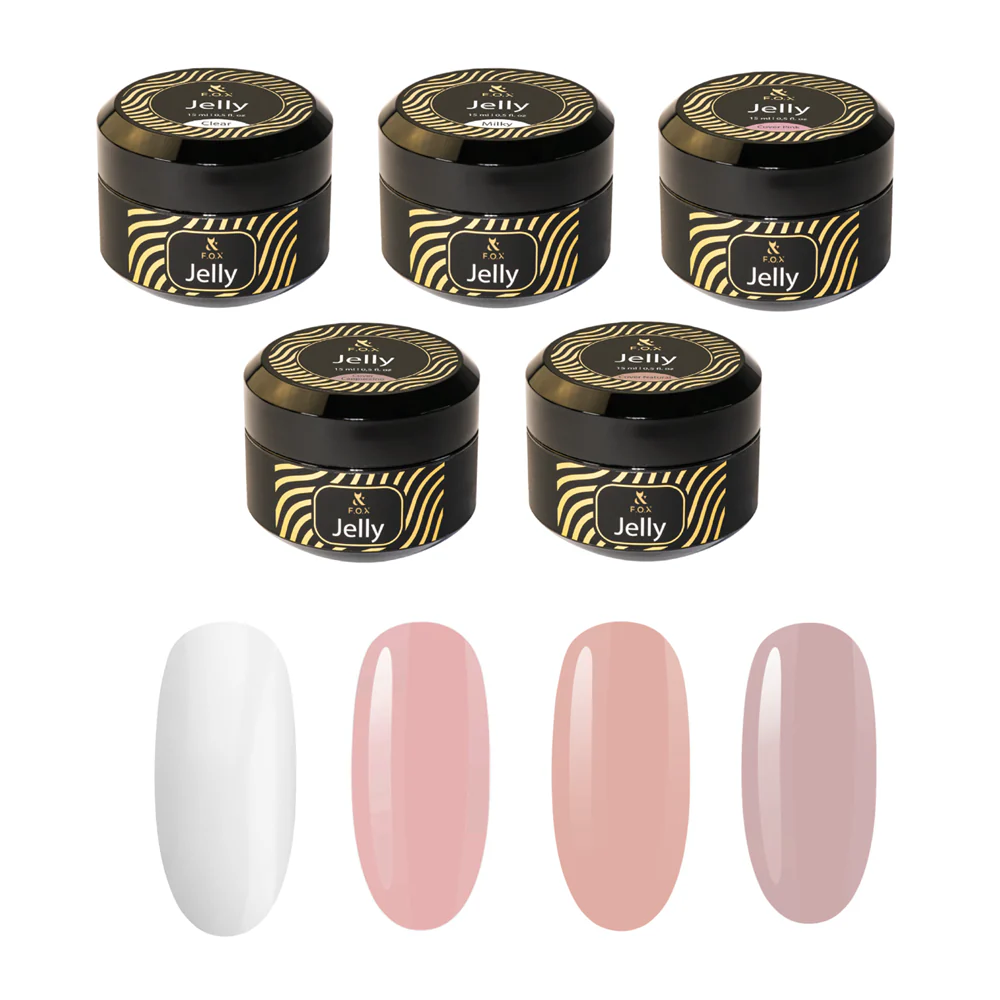 Jelly on geeli, jonka koostumus on hyytelömäinen. Sillä on sopiva viskositeetti ja se pitää täydellisesti monimutkaisen muodon ennen kovettumista, minkä ansiosta voit helposti säätää kynnen muotoa. Mallinnuksen aikana se pysyy paikallaan, mikä mahdollistaa työskentelyn useiden kynsien kanssa samanaikaisesti.Ei itsetasoittuva.