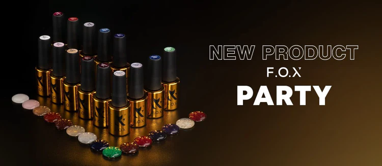 F.O.X Party on erittäin pigmenttinen kokoelma glitteriä sisältäviä hybridikynsilakkoja. Kokoelma sisältää 15 eloisaa, intensiivistä sävyä, jotka tarjoavat erinomaisen peittävyyden vain kahdessa ohuessa kerroksessa kynsilevyllä. Ne sulautuvat kauniisti muihin F.O.X. tuotteita ja ne sopivat täydellisesti ainutlaatuisten kynsimallien ja koristeiden luomiseen. Niitä voidaan käyttää aksentteina erilaisissa Nail Art -tekniikoissa tai luomaan täydellinen kimalteleva lomamanikyyri.