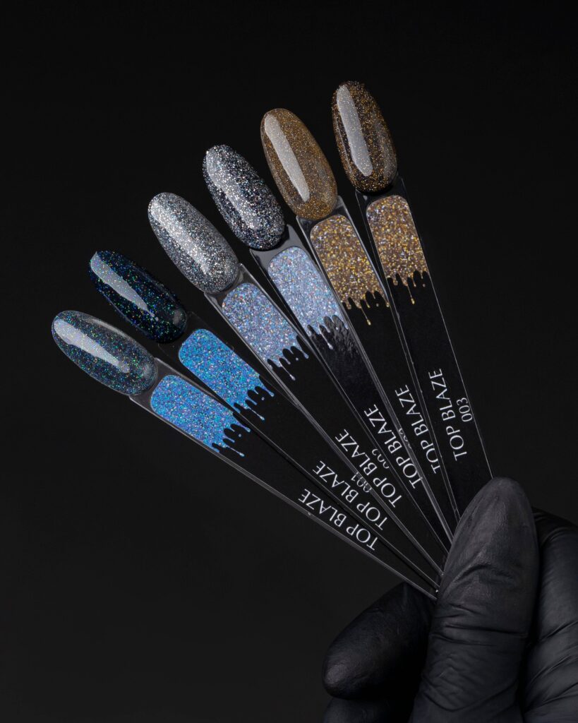 F.O.X Top Blaze on tarttumaton pintalakka, jolla on valoa heijastava vaikutus. Päällinen on läpinäkyvä pohja, joka on täytetty läpinäkyvällä «glitterillä», jossa on sinistä, punaista ja vihreää irisenssia, jotka antavat pinnoitteelle kiiltävän ja kiiltävän vaikutelman.